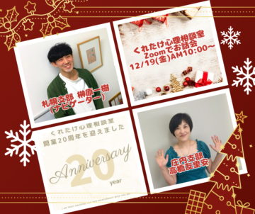 【日 時】12月19日(金)10:00~11:30終了予定 【参加費】無料【内 容】Zoomアプリでのオンライン・フリートーク くれたけ心理相談室の心理カウンセラーを交えて、みなさんとテーマを作ってコミュニケーションを取 […]